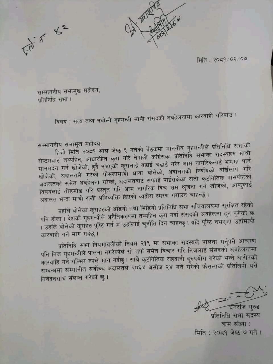 उक्त पत्रमा गत आइतबार गृहमन्त्री लामिछानेले प्रतिनिधि सभाको बैठकमा तथ्यहीन, आधारहीन कुरा गरी कांग्रेसका प्रतिनिधि सभा सदस्यहरुमाथि मानमर्दन गर्न खोजेको, हुँदै नभएको कुरालाई बढाइचढाइ गरेर आम नागरिकलाई भ्रममा पार्न खोजेको नेता गुरुङले लेखेका छन् ।