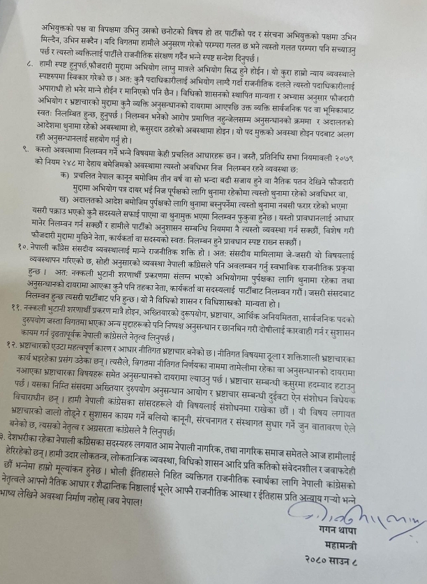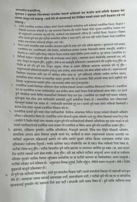 काठमाडौं । पार्टी भित्र फौजदारी अभियोग लागेकालाई निलम्बन गर्नुपर्ने भन्दै नेपाली कांग्रेसका महामन्त्री गगनकुमार थापाले लिखित प्रस्ताव दर्ज गरेका छन् ।