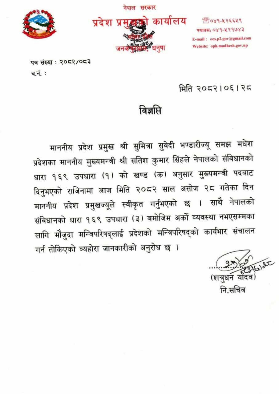 साथै नेपालको संविधानको धारा १६९ उपधारा (३) बमोजिम अर्को व्यवस्था नभएसम्मका लागि मौजुदा मन्त्रिपरिषद्लाई प्रदेशको मन्त्रिपरिषद्को कार्यभार सञ्चालन गर्न तोकिएको प्रमुख प्रमुख कार्यालयको तर्फबाट निजी सचिव शत्रुधन यादवले जारी गरेको विज्ञप्तिमा उल्लेख छ।