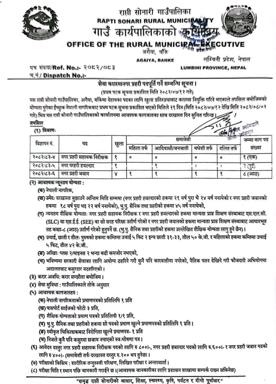 बाँके । बाँकेको राप्ती सोनारी गाउँपालिकाले नगर प्रहरी सहायक निरीक्षक (असई) सहित विभिन्न पदका लागि दर्खास्त आह्वान गरेको छ।