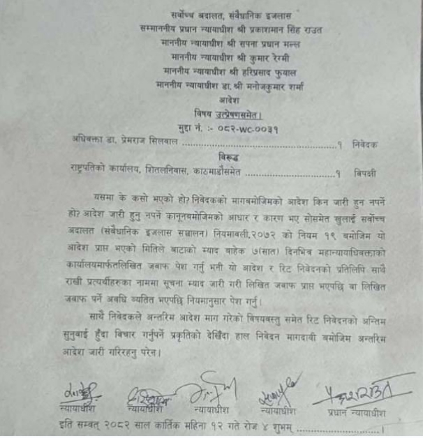 इजलासले रिट निवदेनको मागबमोजिम किन आदेश जारी गर्नु नपर्ने हो रु त्यसको कानुनी आधार र कारण खुलाएर सात दिनभित्र महान्यायाधिवक्ताको कार्यालय मार्फत लिखित जवाफ पेश गर्न राष्ट्रपति कार्यालयलाई आदेश दिएको छ ।