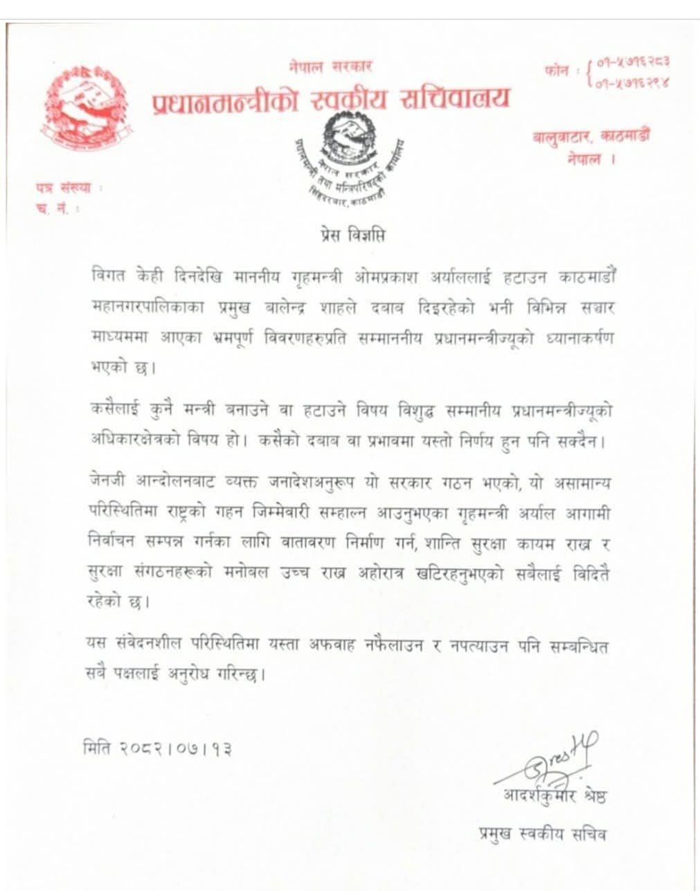 विज्ञप्तिमा भनिएको छ- गृहमन्त्री अर्याललाई हटाउन काठमाडौँ महानगरपालिकाका प्रमुख बालेन्द्र शाहले दबाब दिइरहेको भनी विभिन्न सञ्चार माध्यममा आएका विवरणहरु भ्रमपूर्ण भएको भन्दै प्रधानमन्त्री सुशीला कार्कीको ध्यानाकर्षण भएको उल्लेख रहेको छ ।