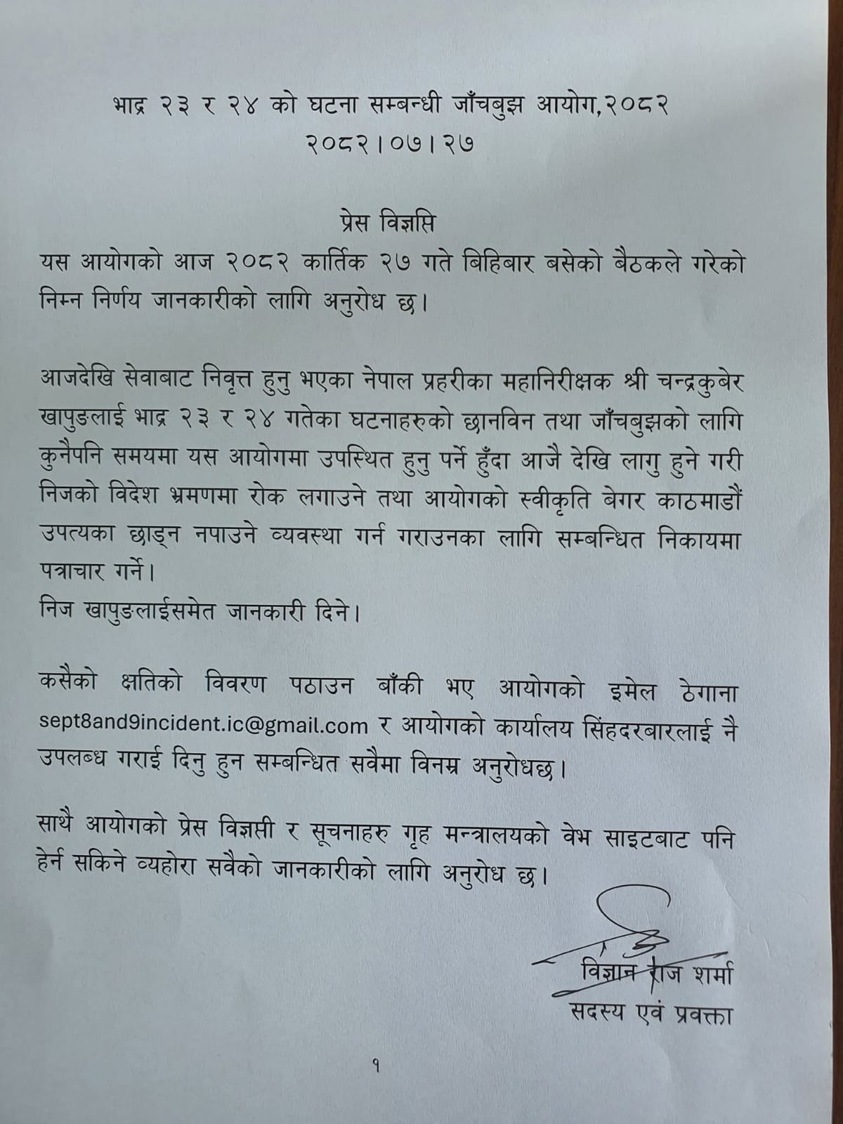 “सेवाबाट आजदेखि अवकाश प्राप्त नेपाल प्रहरीका महानिरीक्षक श्री चन्द्रकुबेर खापुङलाई भाद्र २३ र २४ का घटनासम्बन्धी छानबिनका क्रममा कुनै पनि समयमा आयोगमा उपस्थित हुनुपर्ने भएकाले विदेश भ्रमणमा रोक लगाईएको र आयोगको स्वीकृति बिना उपत्यका नछाड्ने व्यवस्था गर्न सम्बन्धित निकायमा पत्राचार गरिएको छ।”