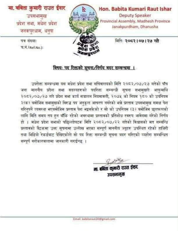 लगातार १० वटा प्रदेश सभा बैठकमा अनुपस्थित भएको भन्दै बिहीवार सभामुख मण्डलले प्रतिशोधको भावनाले ५ सांसदलाई गरिएको पदमुक्तलाई उपसभामुख बबिताले बदर गरेकी हुन् ।