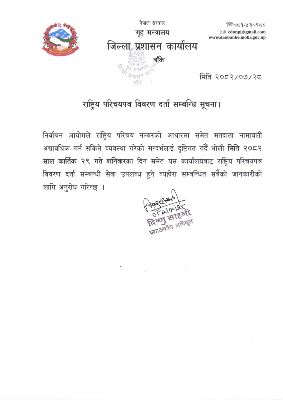 प्रशासकीय अधिकृत विष्णु साहनीले सर्वसाधारणको सहजताको लागि भोलि शनिबार पनि राष्ट्रिय परिचयपत्र दर्ताको काम सुचारु हुने जानकारी दिए ।