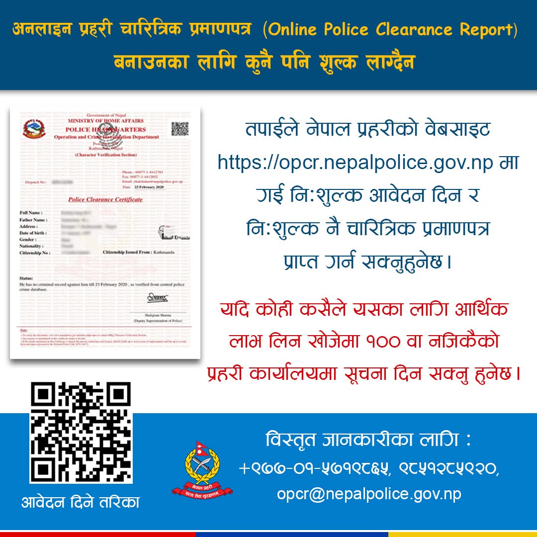 अनलाइन आवेदन दिएपछि कुनै अतिरिक्त शुल्क नतिरी चारित्रिक प्रमाणपत्र प्राप्त गर्न सकिने व्यवस्था गरिएको नेपाल प्रहरीले जनाएको छ ।