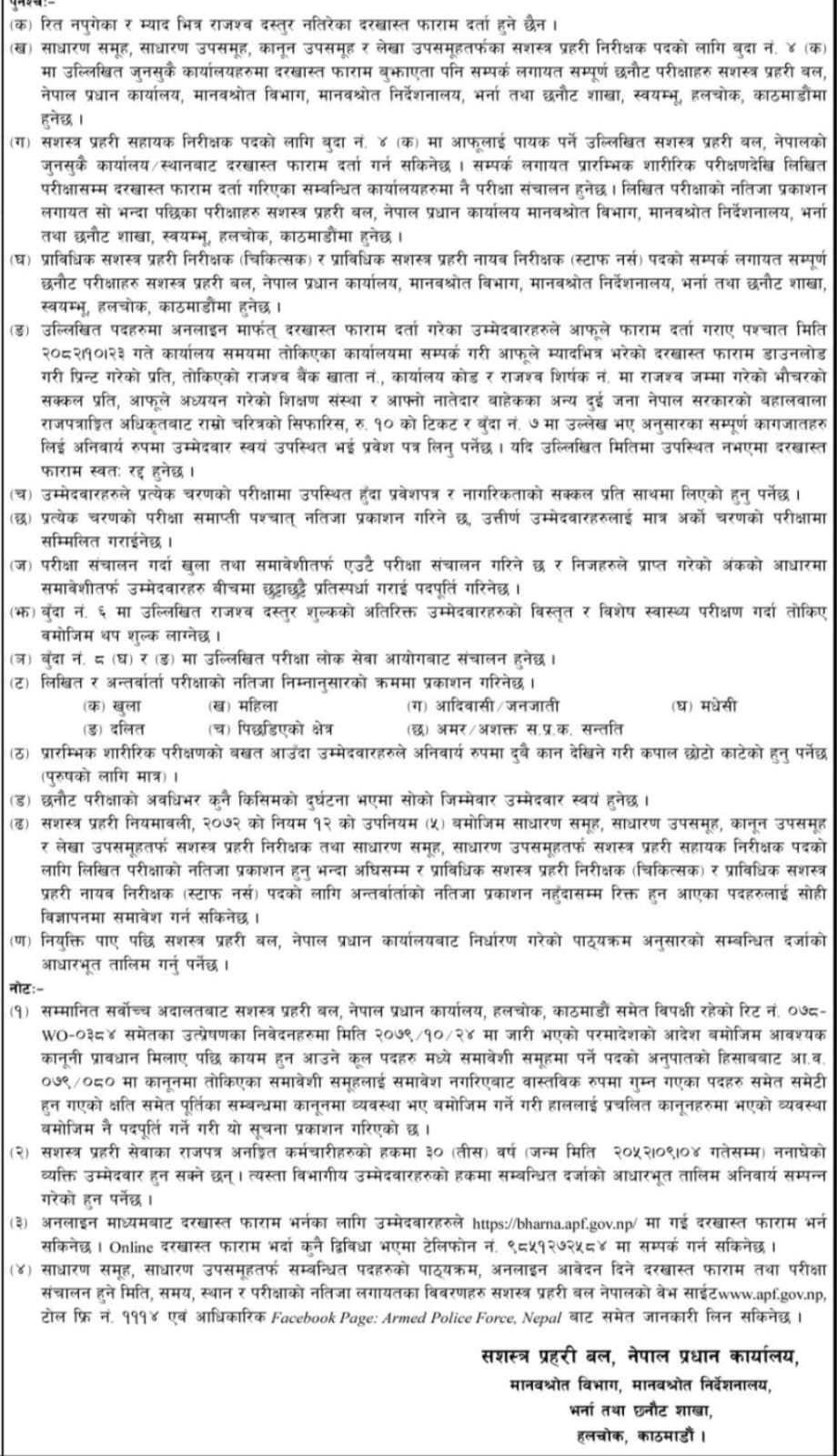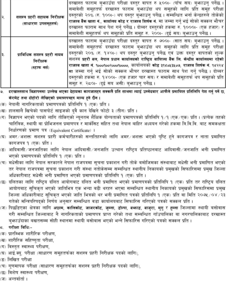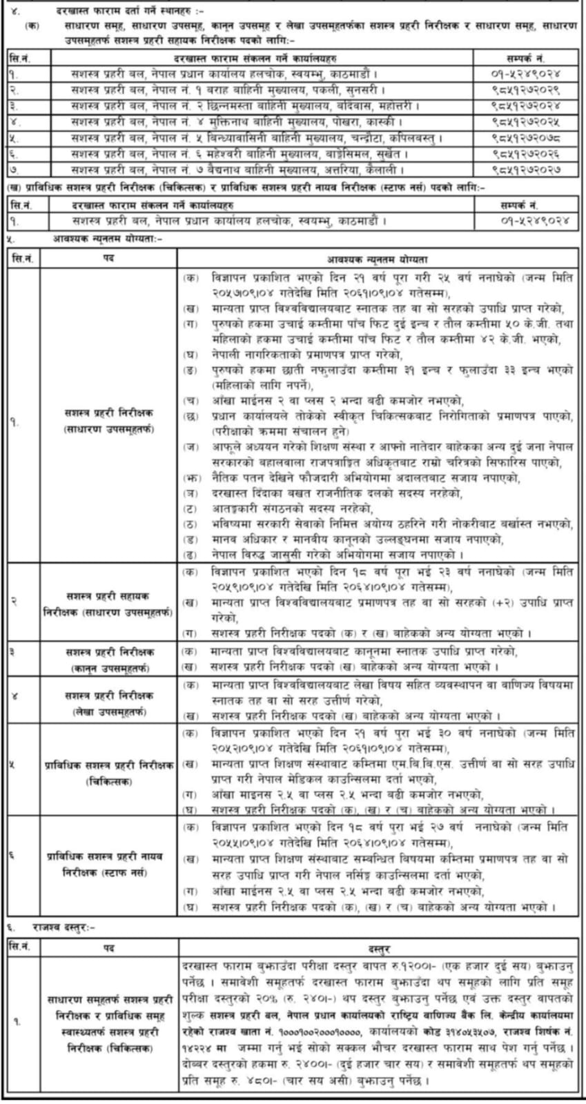 त्यसैगरी सशस्त्र प्रहरीले कानुन उपसमुहतर्फको इन्स्पेक्टरमा ७, लेखा उपसमुहतर्फको इन्स्पेक्टरमा १३ जनाका लागि भर्ना आह्वान गरिएको सशस्त्र प्रहरी प्रधान कार्यालयले जानकारी दिएको छ।