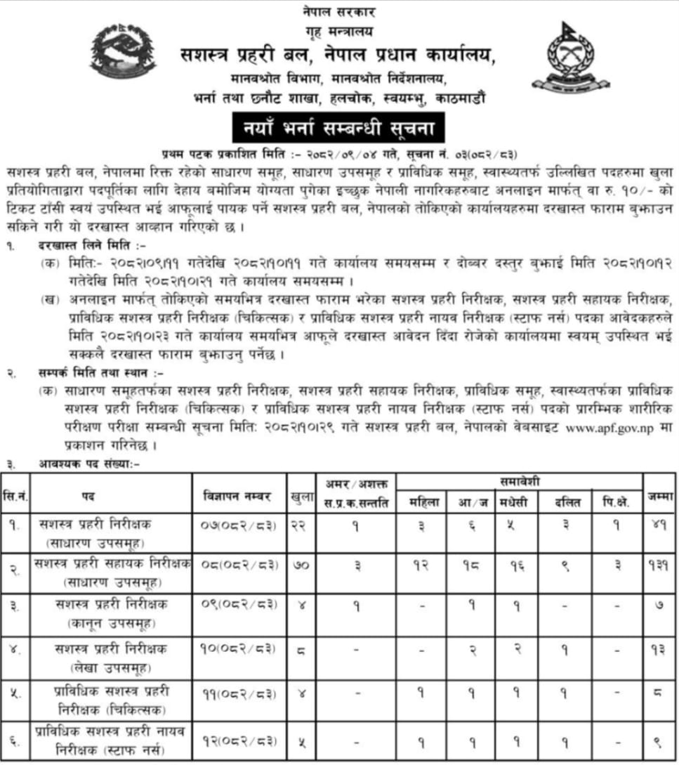 सशस्त्र प्रहरीले प्राविधिकतर्फको चिकित्सकका लागि ८ इन्स्पेक्टर र स्टाफ नर्सका ९ जना सईका लागि भर्ना आह्वान गरेको जनाएको छ।