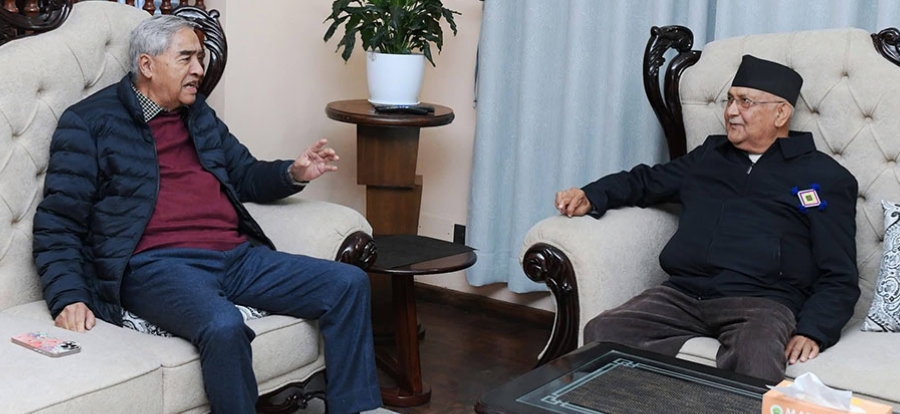 काठमाडौँ । नेपाली कांग्रेसका सभापति शेरबहादुर देउवा र नेकपा एमालेका अध्यक्ष केपी शर्मा ओलीबीच एक साताको अन्तरमै दोस्रोपटक भेटवार्ता भएको छ । गत मंसिर २९ गते देउवालाई भेट्न पत्नी राधिका शाक्यलाई लिएर गएका ओली आज भने पार्टी महासचिव शंकर पोखरेललाई लिएर महाराजगञ्जस्थित उनको वासस्थल पुगेका हुन् ।