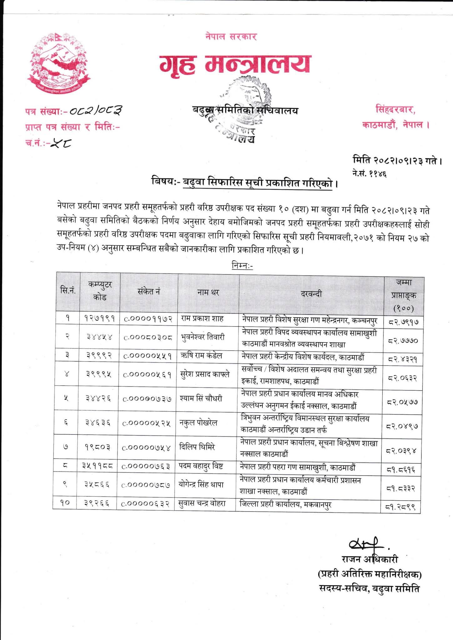 प्रहरी प्रधान कार्यालयका अनुसार संगठन तथा व्यवस्थापन सर्वेक्षण (ओएन्डएम)का आधारमा प्राविधिक समूहका दुई एसएसपी दरबन्दी जनपद समूहमा स्थानान्तरण गरिएको हो। साथै, मन्त्रिपरिषद्को निर्णयअनुसार एक अतिरिक्त दरबन्दी थप भएसँगै कुल १० जनालाई बढुवाका लागि सिफारिस गरिएको हो।