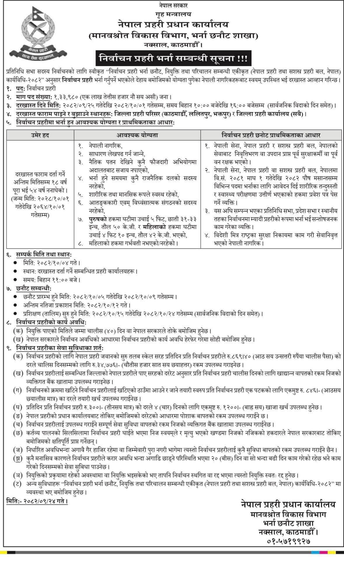 साधारण लेखपढ गर्न जान्ने, १८ वर्ष पूरा भई ५४ वर्ष ननाघेका नेपाली नागरिकले निर्वाचन प्रहरीमा आवेदन दिन सक्नेछन् । उम्मेदवार छनोट प्रक्रिया माघ ५ देखि ९ गतेसम्म सञ्चालन हुने र माघ १२ गते अन्तिम नतिजा सार्वजनिक गरिने जनाइएको छ ।