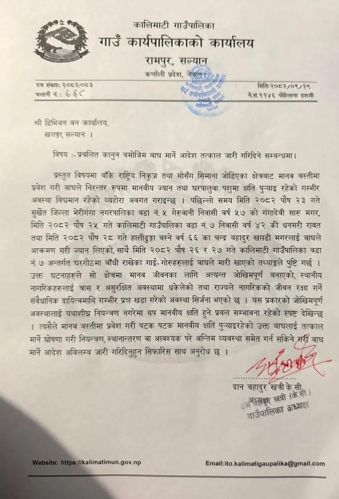 सल्यान । लगातार एक साता भित्रै तीन जना स्थानीयको बाघको आक्रमणबाट मृत्यु भएपछि गाउँपालिकाले बाघ मार्ने आदेश माग गरेको छ । सल्यानको कालिमाटी गाउँपालिकाका अध्यक्ष दानबहादुर खत्री केसीले डिभिजन वन कार्यालय खलंगा सल्यानमा पत्रकार गर्दै प्रचलित कानुन बमोजिम बाघ मार्ने आदेश तत्काल जारी गरिदिन पत्राचार गरेका छन् ।
