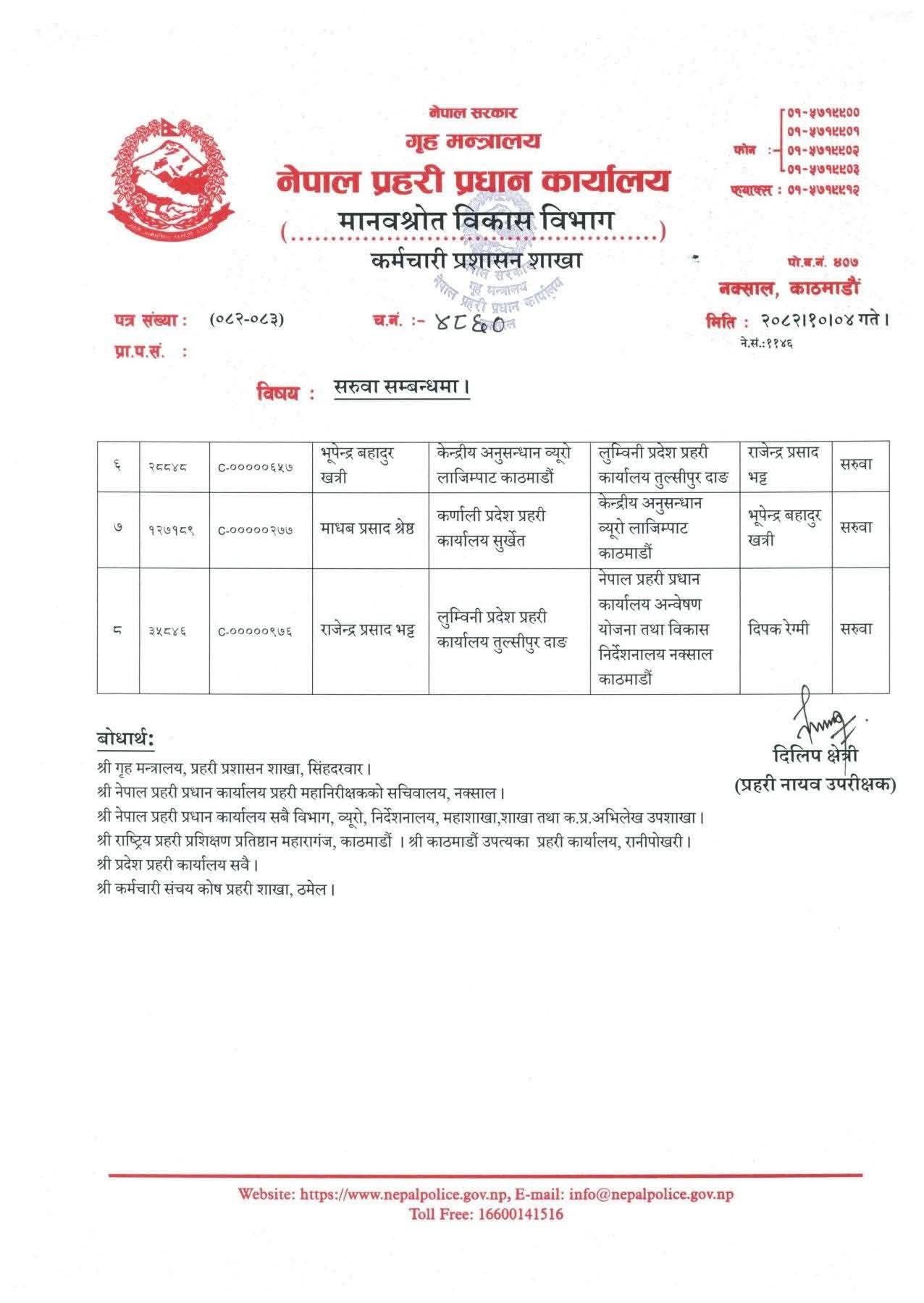सरुवामा डीआईजी भुपेन्द्र बहादुर खत्रीलाई लुम्बिनी प्रदेश प्रहरी कार्यालय दाङको जिम्मेवारी दिइएको छ भने लुम्बिनीका डीआईजी राजेन्द्र प्रसाद भट्टको प्रहरी प्रधान कार्यालयको अन्वेषण योजना निर्देशनालयमा सरुवा भएको छ।