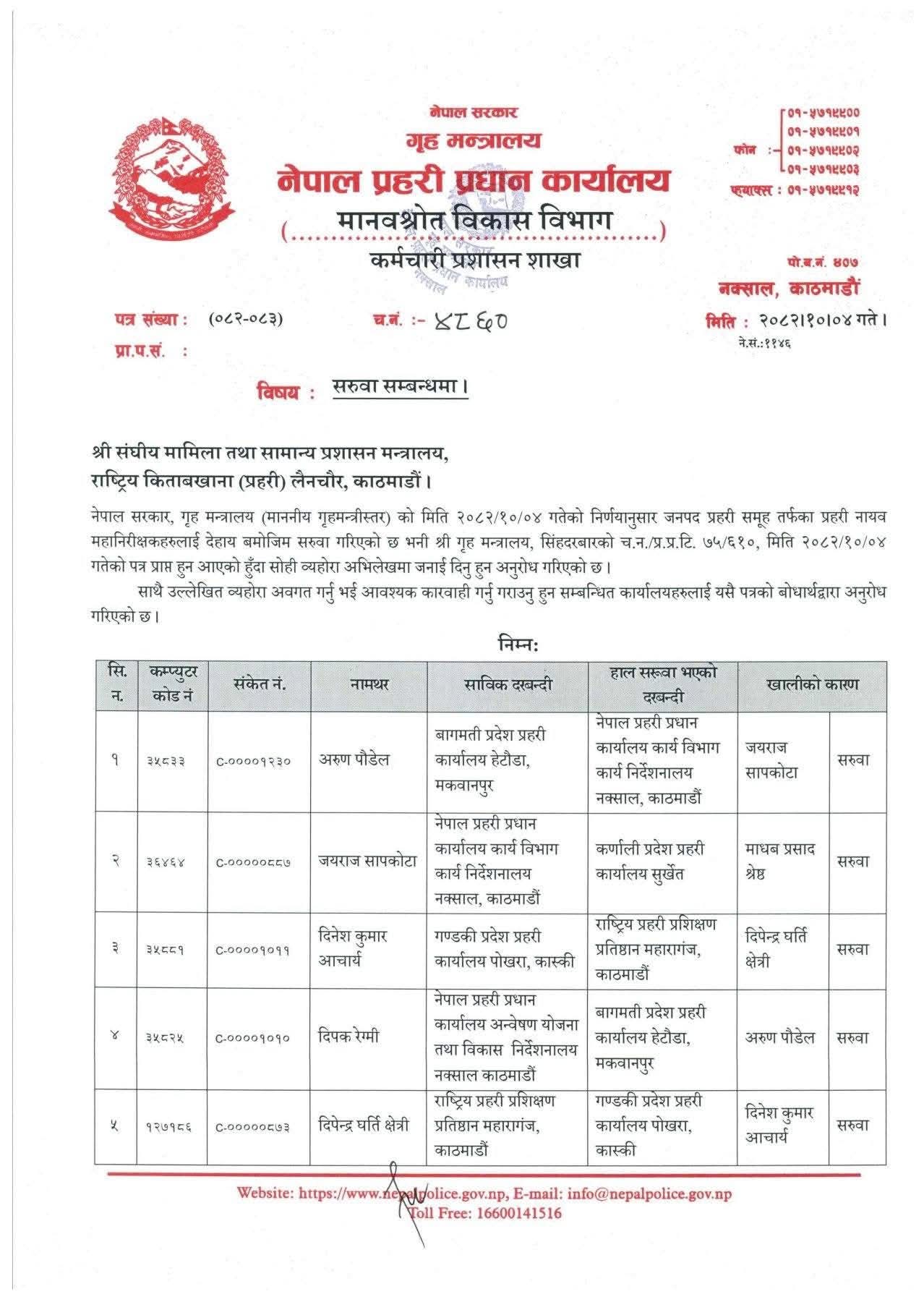 त्यसैगरी बागमती प्रदेशका डीआईजी अरुण पौडेलको कार्य विभाग कार्य निर्देशनालयमा सरुवा भएको छ। डीआईजी जयराज सापकोटाको कर्णाली प्रदेश र दिपेन्द्र घर्ती क्षेत्रीको गण्डकी प्रदेशम सरुवा गरिएको छ।