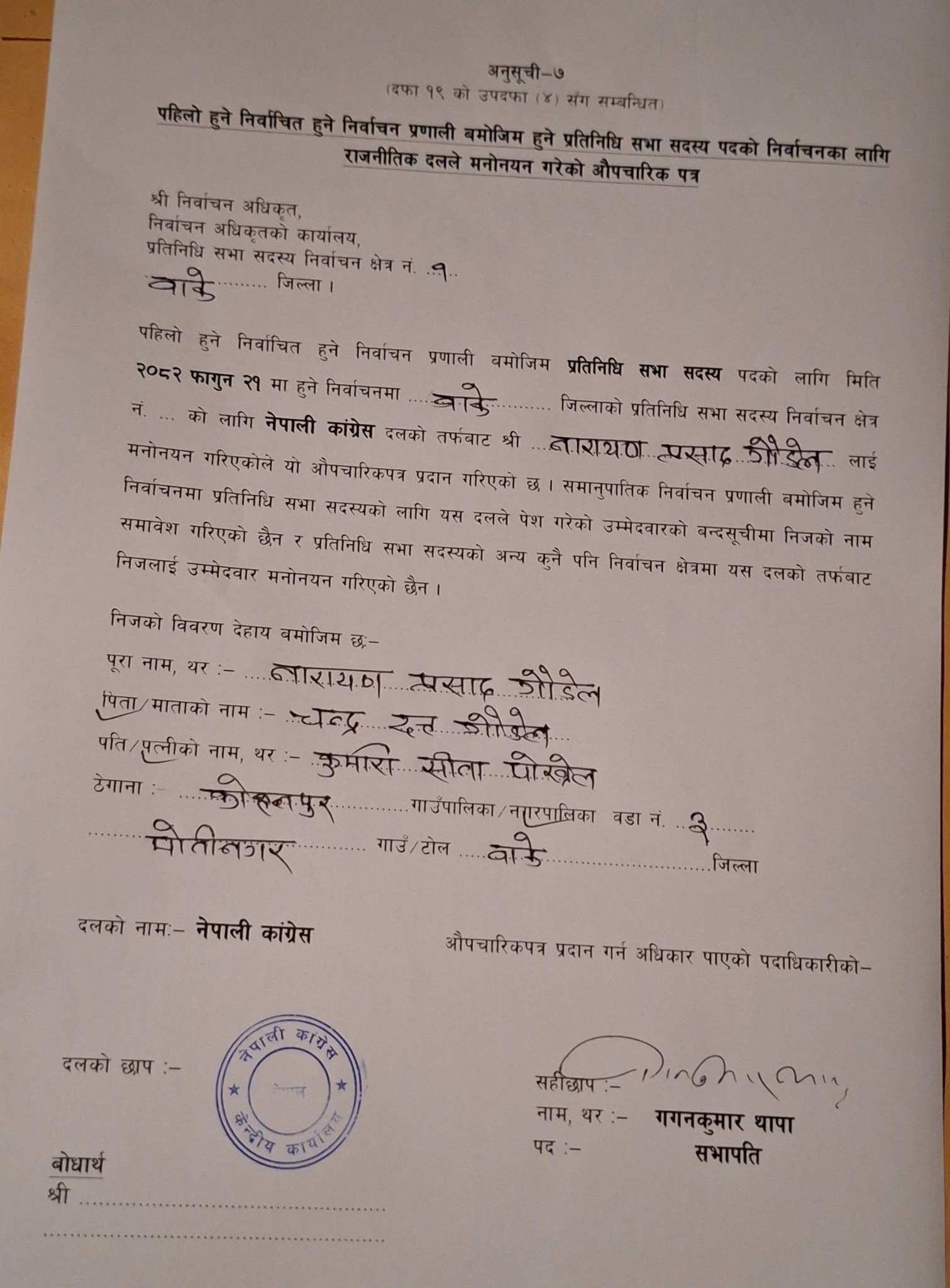नेपालगञ्ज । नेपाली कांग्रेसले बाँके १ मा जिल्ला सभापति नारायण प्रसाद गौडेललाई उम्मेदवार बनाएको छ ।