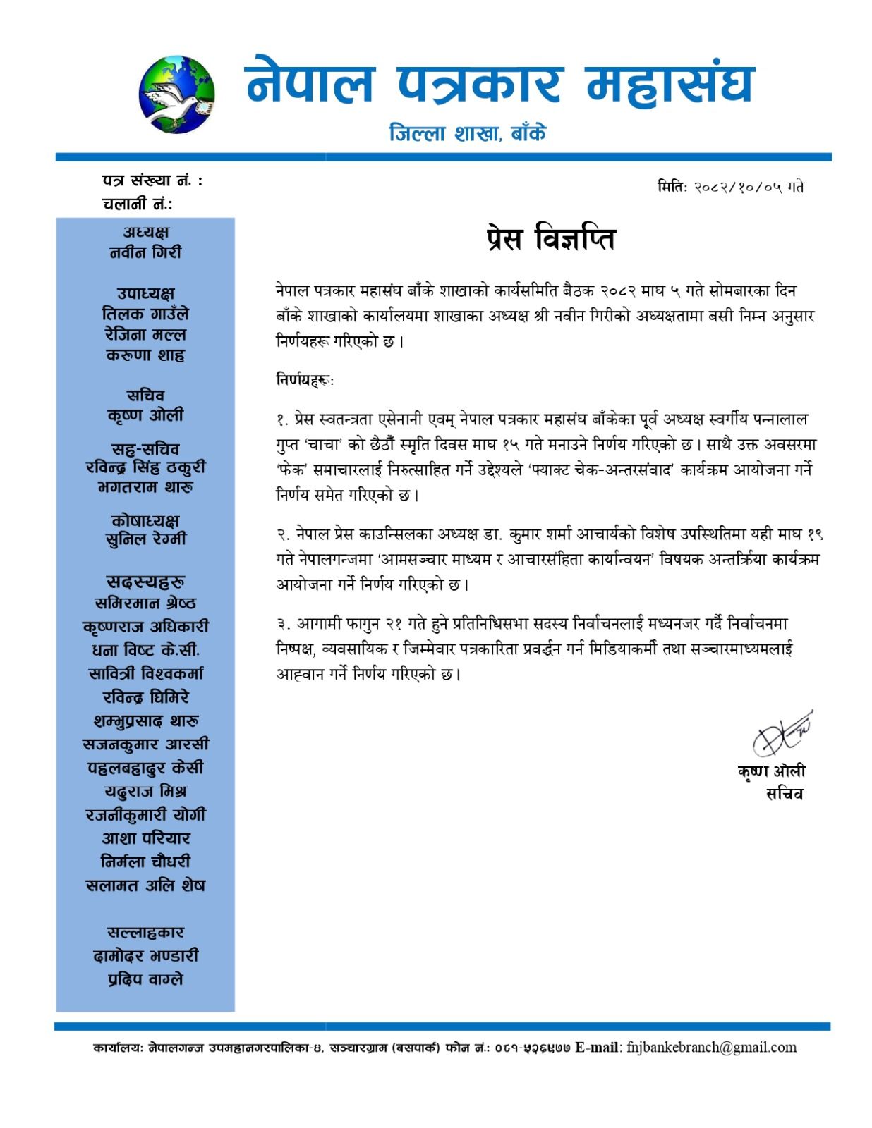 बाँके शाखाको कार्यालय नेपालगञ्ज-४ सञ्चारग्राम (बसपार्क) मा शाखाका अध्यक्ष नवीन गिरीको अध्यक्षतामा बसेको वैठकले प्रेस स्वतन्त्रता सेनानी एवम् नेपाल पत्रकार महासंघ बाँकेका पूर्व अध्यक्ष स्वर्गीय पन्नालाल गुप्त ‘चाचा’ को छैठौँ स्मृति दिवस माघ १५ गते मनाउने निर्णय गरेको छ । साथै उक्त अवसरमा ‘फेक’ समाचारलाई निरुत्साहित गर्ने उद्देश्यले ‘फ्याक्ट चेक–अन्तरसंवाद’ कार्यक्रम आयोजना गर्ने निर्णय समेत गरिएको सचिव कृष्ण ओलीले जानकारी दिए ।