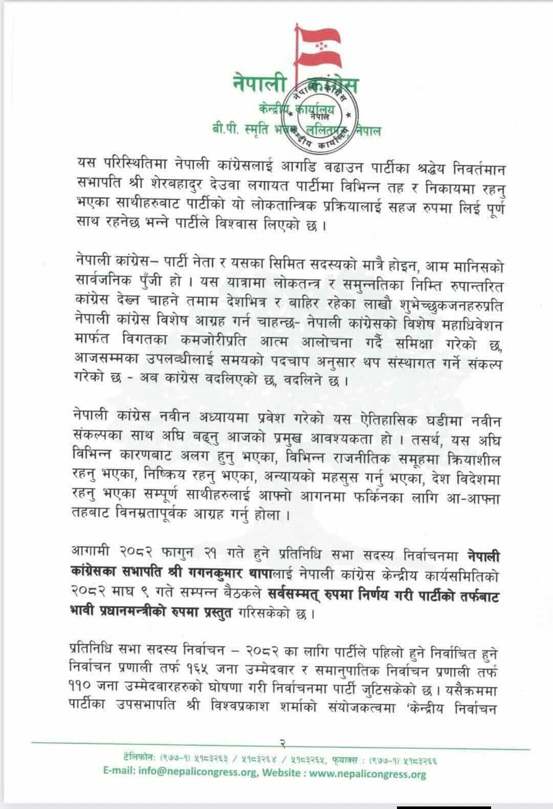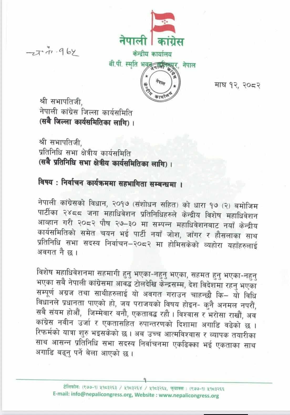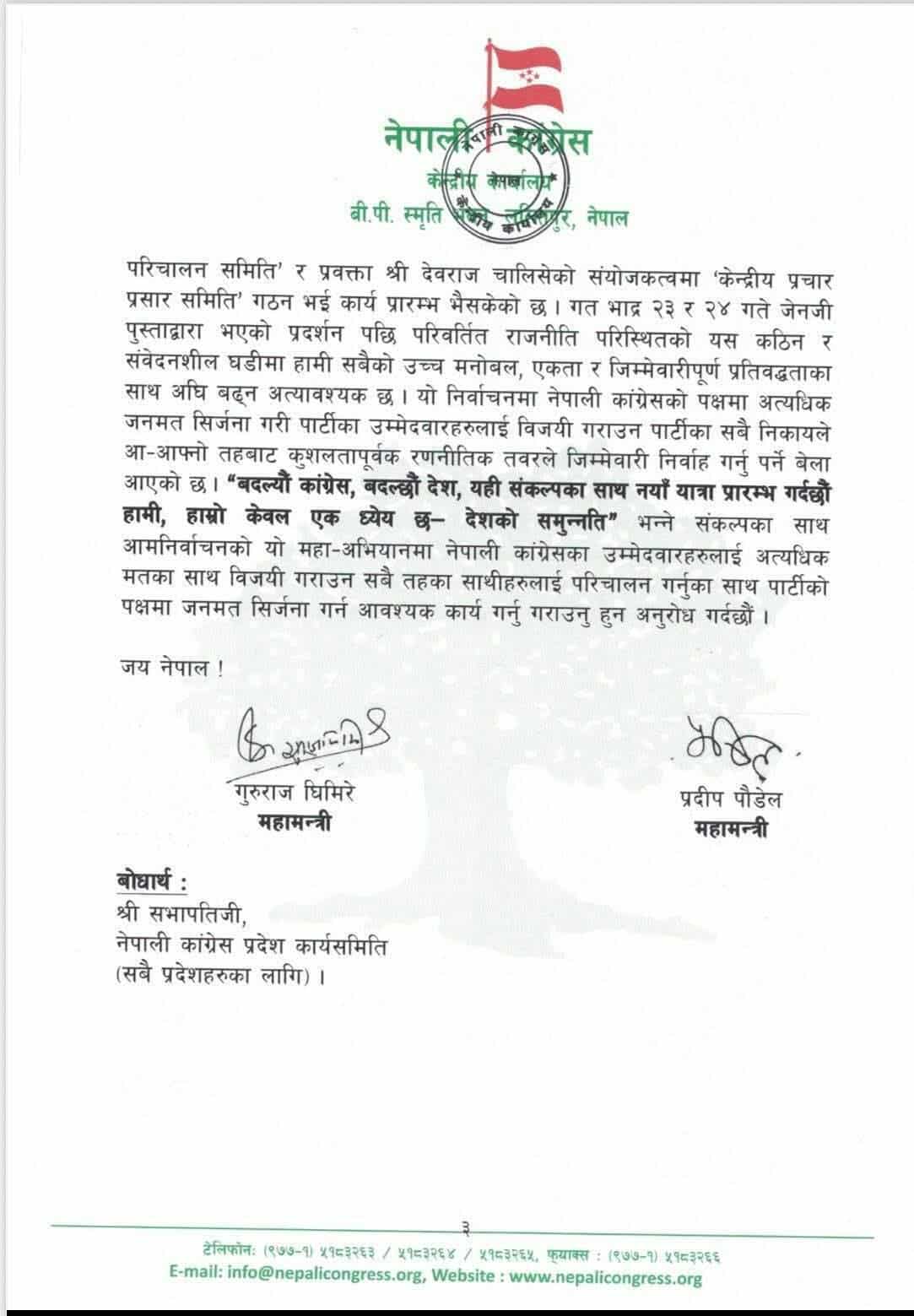 आगामी निर्वाचनमा कांग्रेसको पक्षमा व्यापक जनसमर्थन निर्माण गरी पार्टीका उम्मेदवारलाई विजयी गराउन सबै निकायले आ–आफ्नो तहबाट रणनीतिक र प्रभावकारी भूमिका निर्वाह गर्नुपर्ने समय आएको परिपत्रमा उल्लेख छ।