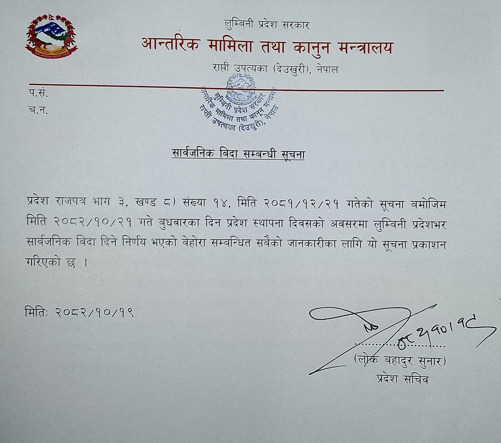प्रदेश सरकारको आन्तरिक मामिला तथा कानुन मन्त्रालयले जारी गरेको सूचनाअनुसार, प्रदेश सभाको पहिलो बैठक बसेको दिनलाई लुम्बिनी प्रदेश स्थापनाको रूपमा मान्यता दिँदै सो अवसरमा बिदा दिएको हो।