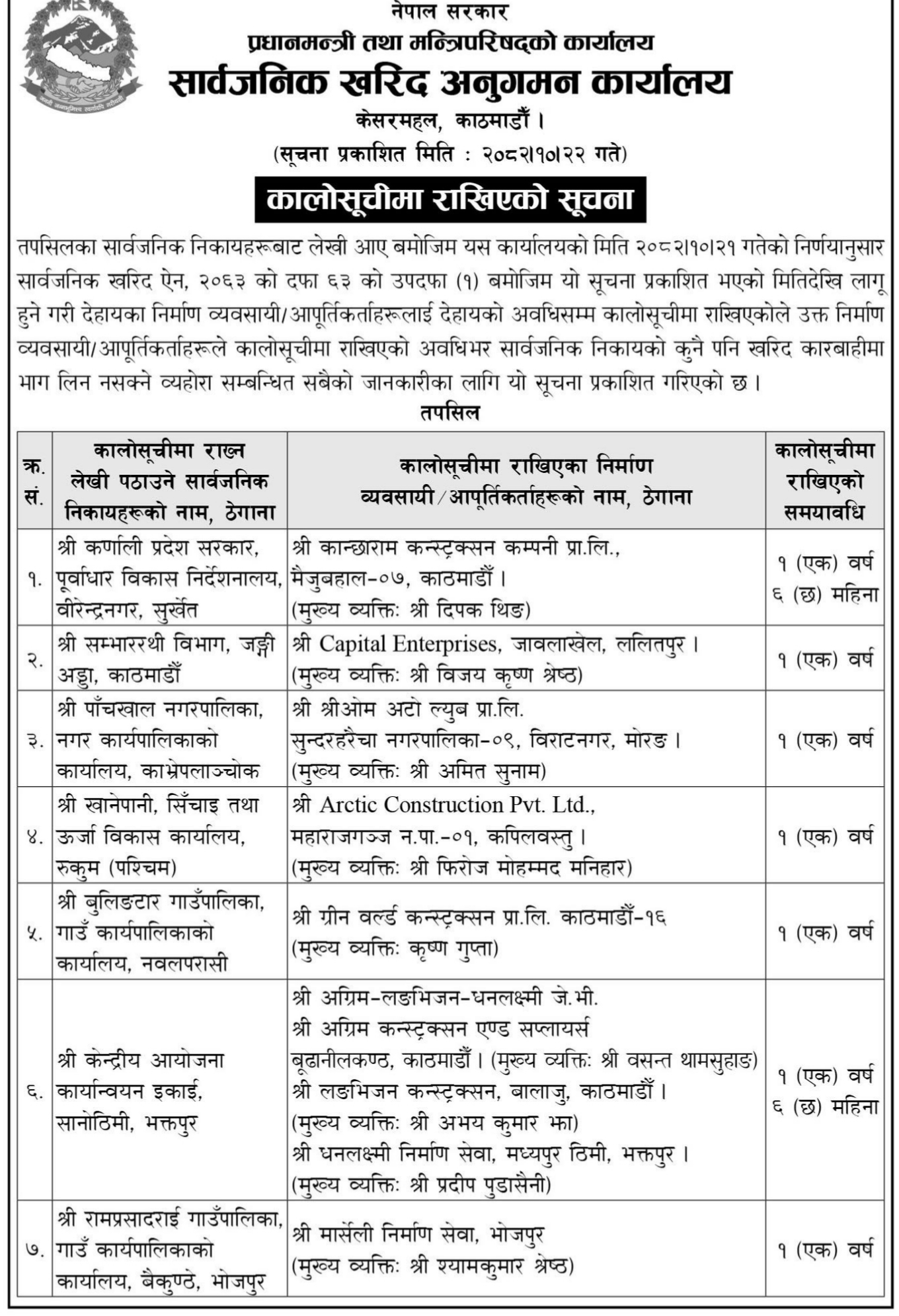 कार्यालयले आज सार्वजनिक गरेको सूचनाअनुसार कालोसूचीमा समावेश भएका यी व्यवसायी तथा आपूर्तिकर्ताले तोकिएको अवधिसम्म देशभरका कुनै पनि सार्वजनिक निकायको खरिद प्रक्रियामा सहभागिता जनाउन पाउने छैनन्।