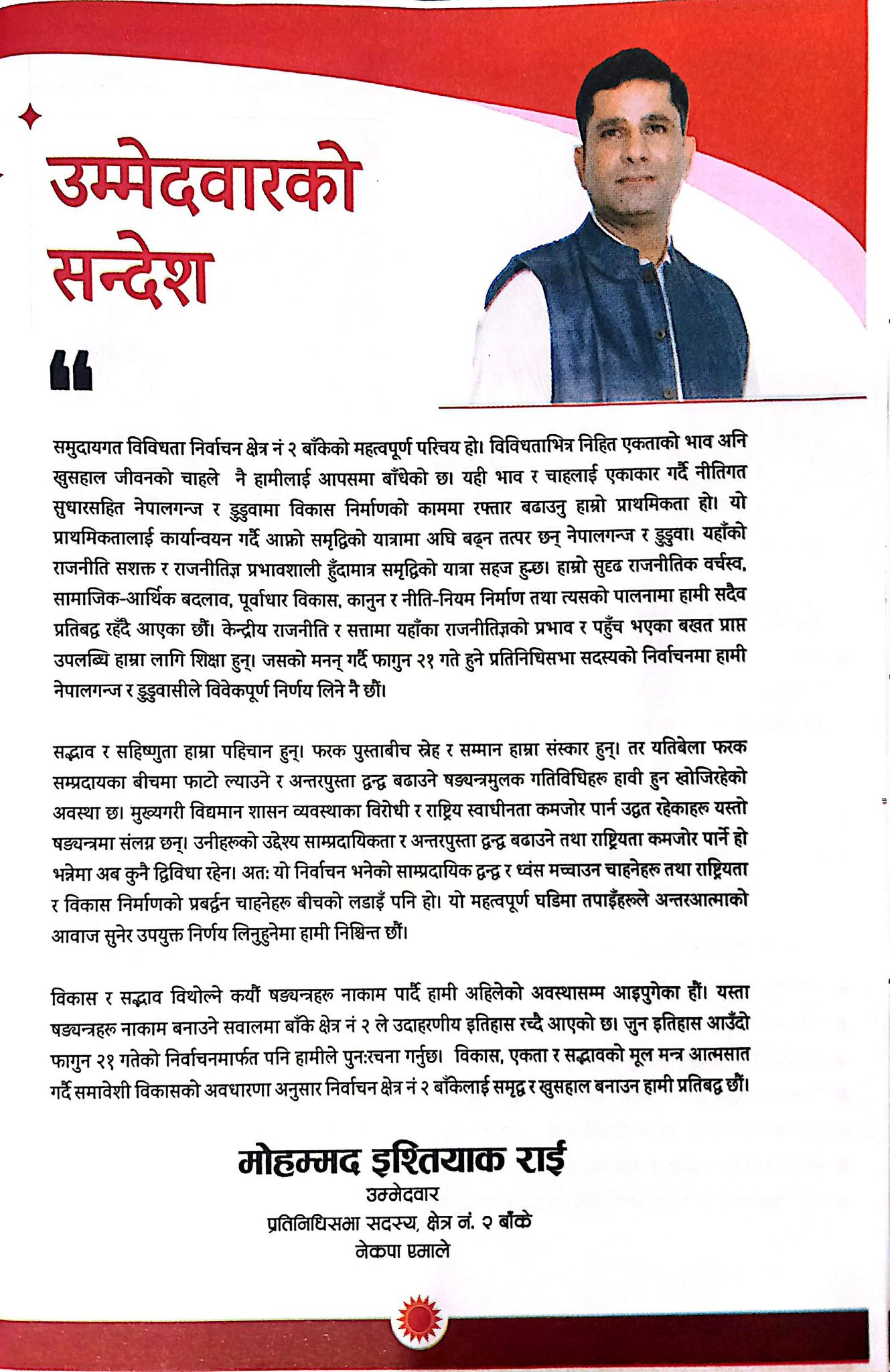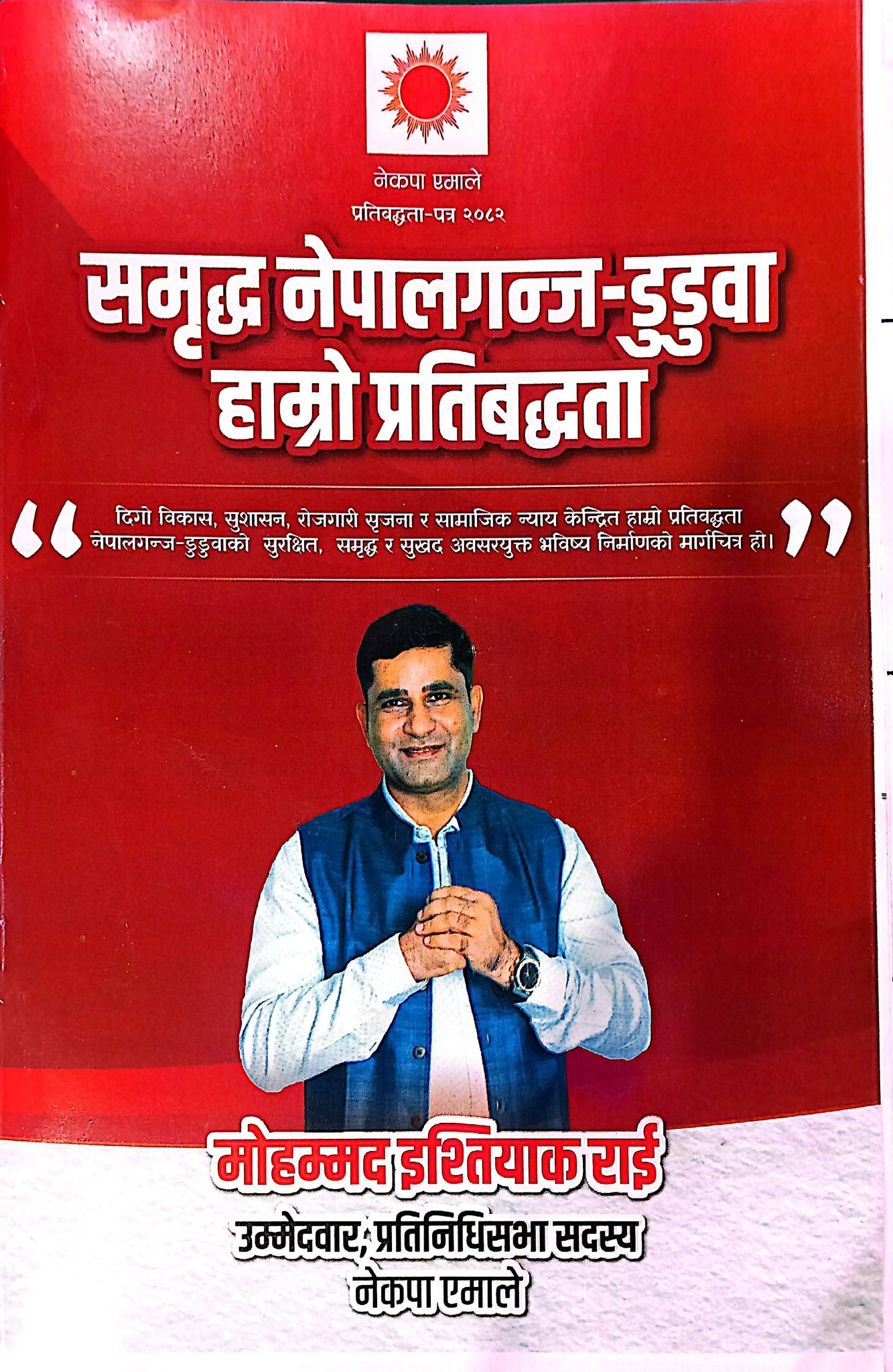 नेपालगञ्ज । नेकपा एमालेका तर्फबाट बाँके क्षेत्र नम्बर २ का उम्मेदवार मोहम्मद इश्तियाक राईले आफ्नो चुनावी प्रतिबद्धता-पत्र सार्वजनिक गरेका छन् । नेपालगञ्ज आज आयोजित एक कार्यक्रमका बीच राईले 'समृद्ध नेपालगञ्ज-डुडुवा-हाम्रो प्रतिबद्धता' भन्ने मुख्य नाराका साथ प्रतिबद्धतापत्र सार्वजनिक गरेका हुन् ।