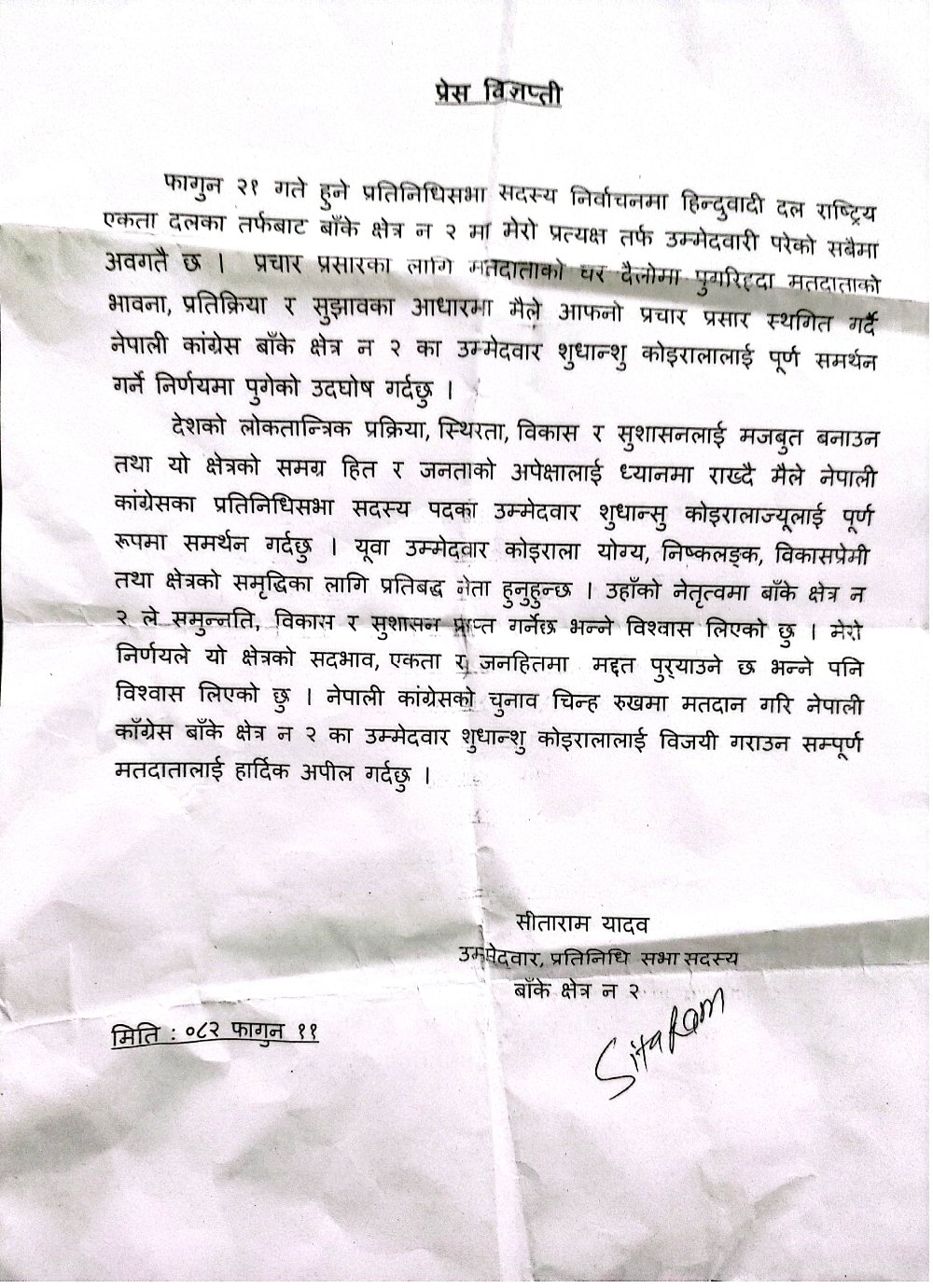 नेपाली काँग्रेस बाँके क्षेत्र नम्बर २ का उम्मेदवार कोइरालालाई विजयी गराउन यादवले सम्पूर्ण मतदातालाई अपील गरेका छन् । चुनावमा आफ्ना समर्थकहरुलाई चुनाव चिन्ह 'तुलसीको बोट' को सट्टा अब चुनाव चिन्ह 'रुख' मा मतदान गर्न उनको आग्रह छ।