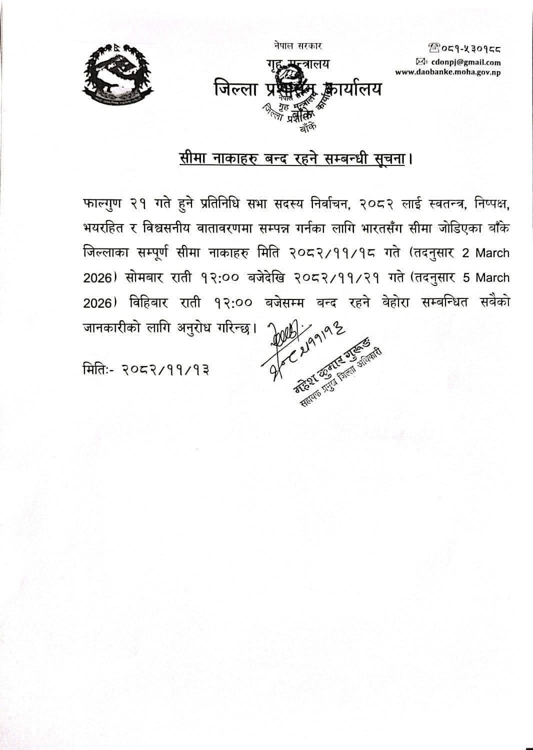 जिल्ला प्रशासन कार्यालय बाँकेले जारी गरेको सूचनाअनुसार फागुन १८ गते (तदनुसार २ मार्च २०२६) सोमबार राति १२:०० बजेदेखि फागुन २१ गते (तदनुसार ५ मार्च २०२६) बिहीबार राति १२:०० बजेसम्म जिल्लाका सम्पूर्ण सीमा नाका बन्द रहनेछन्।