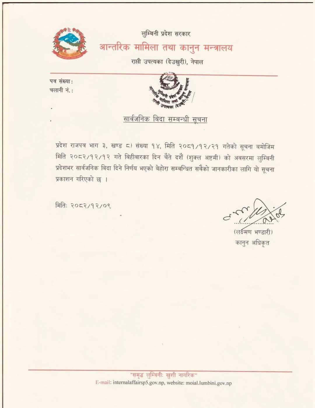 मन्त्रालयका अनुसार प्रदेश राजपत्रमा प्रकाशित सूचनाअनुसार उक्त दिन प्रदेश अन्तर्गतका सबै सरकारी कार्यालय तथा सार्वजनिक निकायहरू बन्द रहनेछन्।