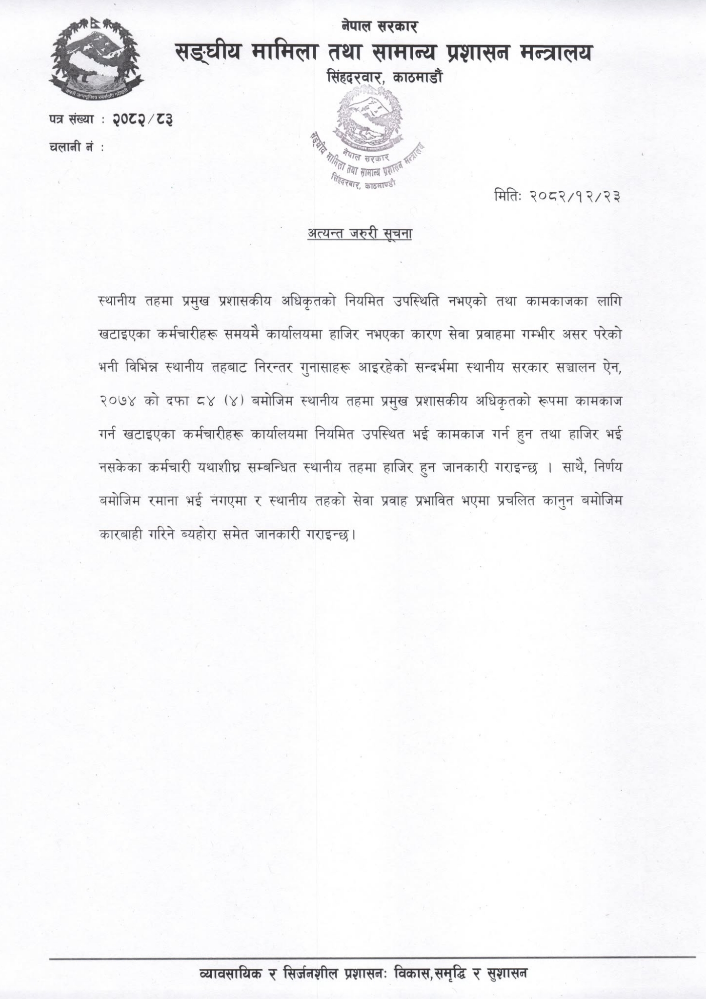 मन्त्रालयले स्थानीय सरकार सञ्चालन ऐन, २०७४ अन्तर्गतको प्रावधान स्मरण गराउँदै सबै सम्बन्धित कर्मचारीलाई यथाशीघ्र आ-आफ्नो कार्यस्थलमा पुगेर जिम्मेवारी सम्हाल्न आग्रह गरेको छ। साथै, तोकिएको स्थानमा नजाने वा सेवा प्रवाहमा असर पर्ने गरी लापरवाही गरेमा प्रचलित कानुनअनुसार कारबाही गरिने चेतावनी समेत दिएको छ।