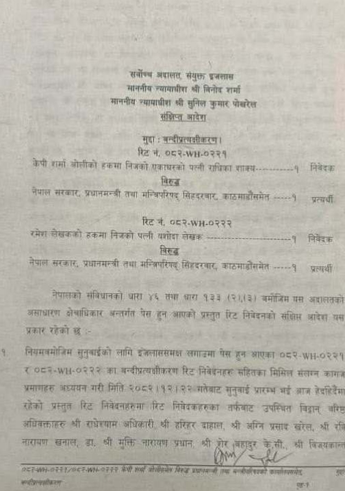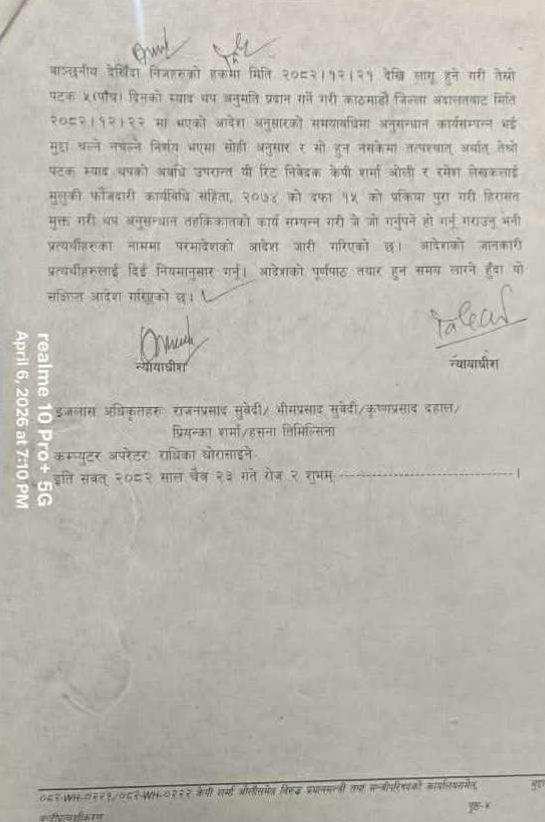 न्यायाधीशद्वय विनोद शर्मा र सुनिल कुमार पोखरेल को संयुक्त इजलासले २६ चैतभित्र अनुसन्धान प्रक्रिया टुङ्ग्याउन आदेश दिएको छ। यदि सो अवधिसम्म पनि अनुसन्धान पूरा हुन नसकेमा भने उनीहरूलाई रिहा गर्नुपर्ने अदालतको स्पष्ट भनाइ छ।
