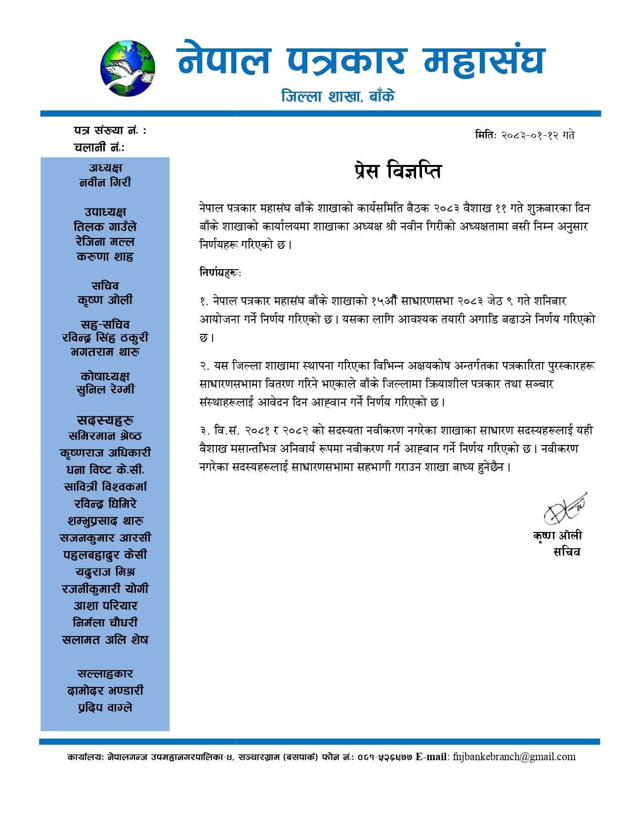 शाखा अध्यक्ष नवीन गिरीको अध्यक्षतामा बसेको बैठकले साधारणसभा सफल बनाउन आवश्यक तयारी तीव्र पार्ने निर्णय समेत गरेको छ । साथै, जिल्लामा स्थापना गरिएका विभिन्न अक्षयकोष अन्तर्गतका पत्रकारिता पुरस्कारहरू साधारणसभामा वितरण गरिने जनाइएको छ । यसका लागि बाँके जिल्लामा क्रियाशील पत्रकार तथा सञ्चार संस्थाहरूलाई आवेदन दिन आह्वान गरिएको छ ।