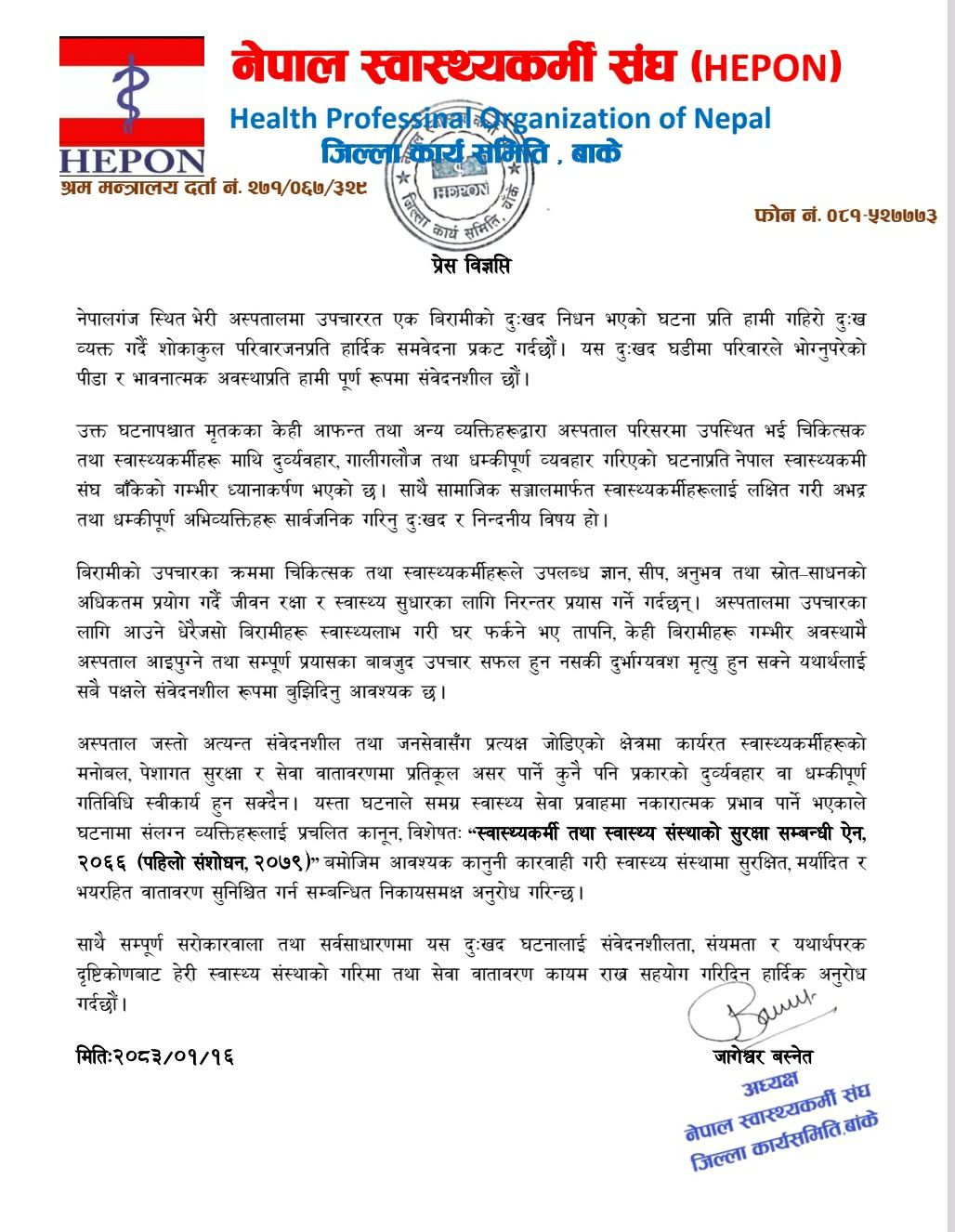 साथै, सम्पूर्ण सरोकारवाला र सर्वसाधारणलाई घटनालाई संयमता र यथार्थपरक दृष्टिकोणबाट हेर्दै स्वास्थ्य संस्थाको गरिमा कायम राख्न सहयोग गर्न नेपाल स्वास्थ्यकर्मी संघ बाँकेले आग्रह गरेको छ।